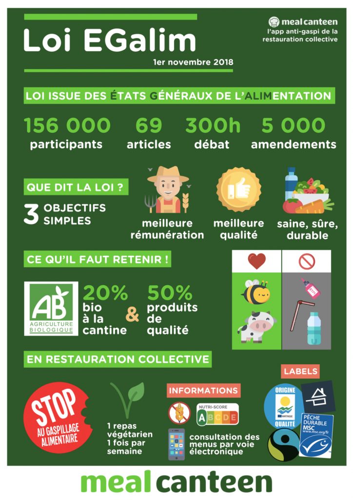 Après plusieurs lectures, cette loi est finalement composée de 71 articles (23 ayant été censuré). Elle traite de 16 sujets. L’article 24 traite principalement de la restauration collective et impose un seuil de produits de: